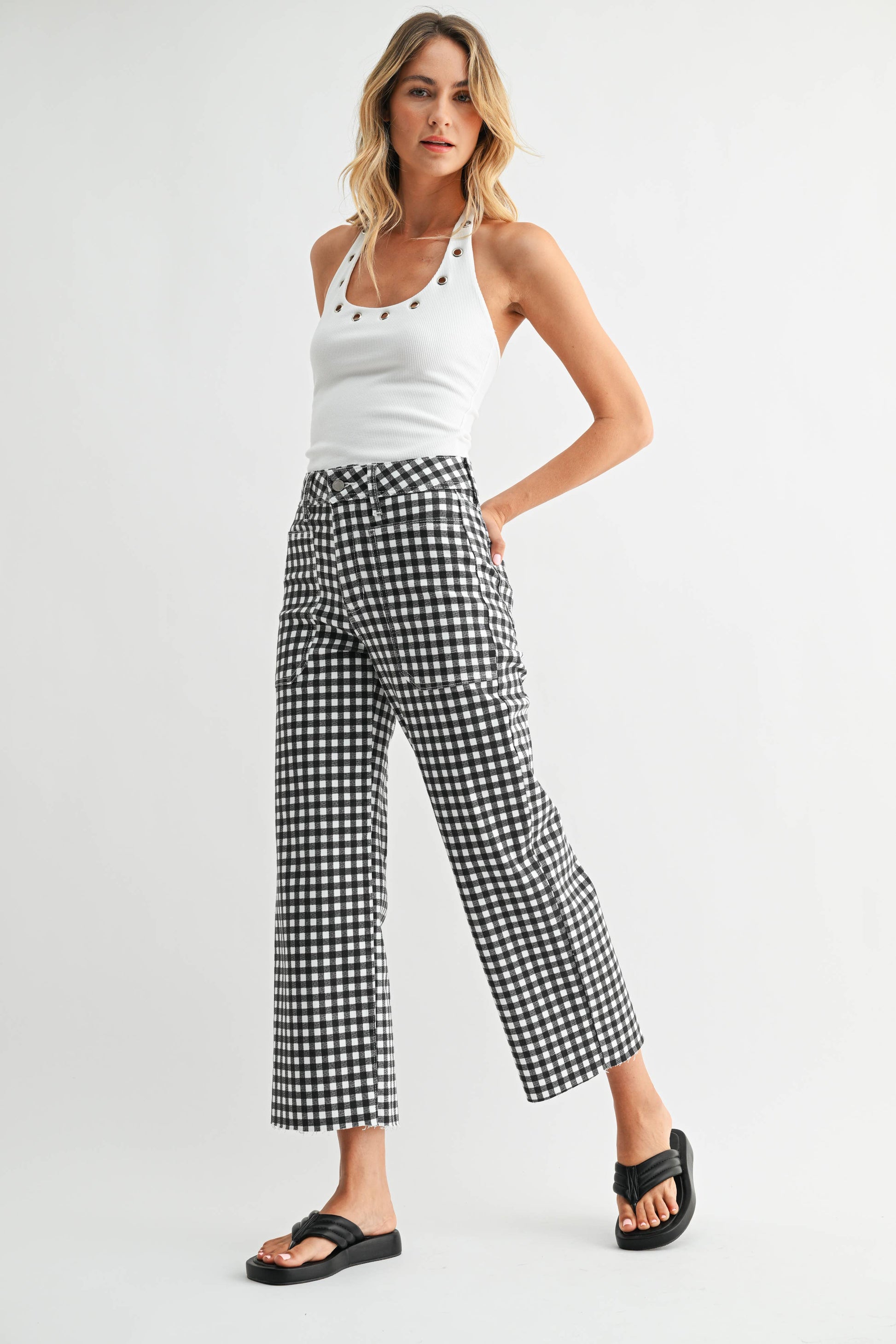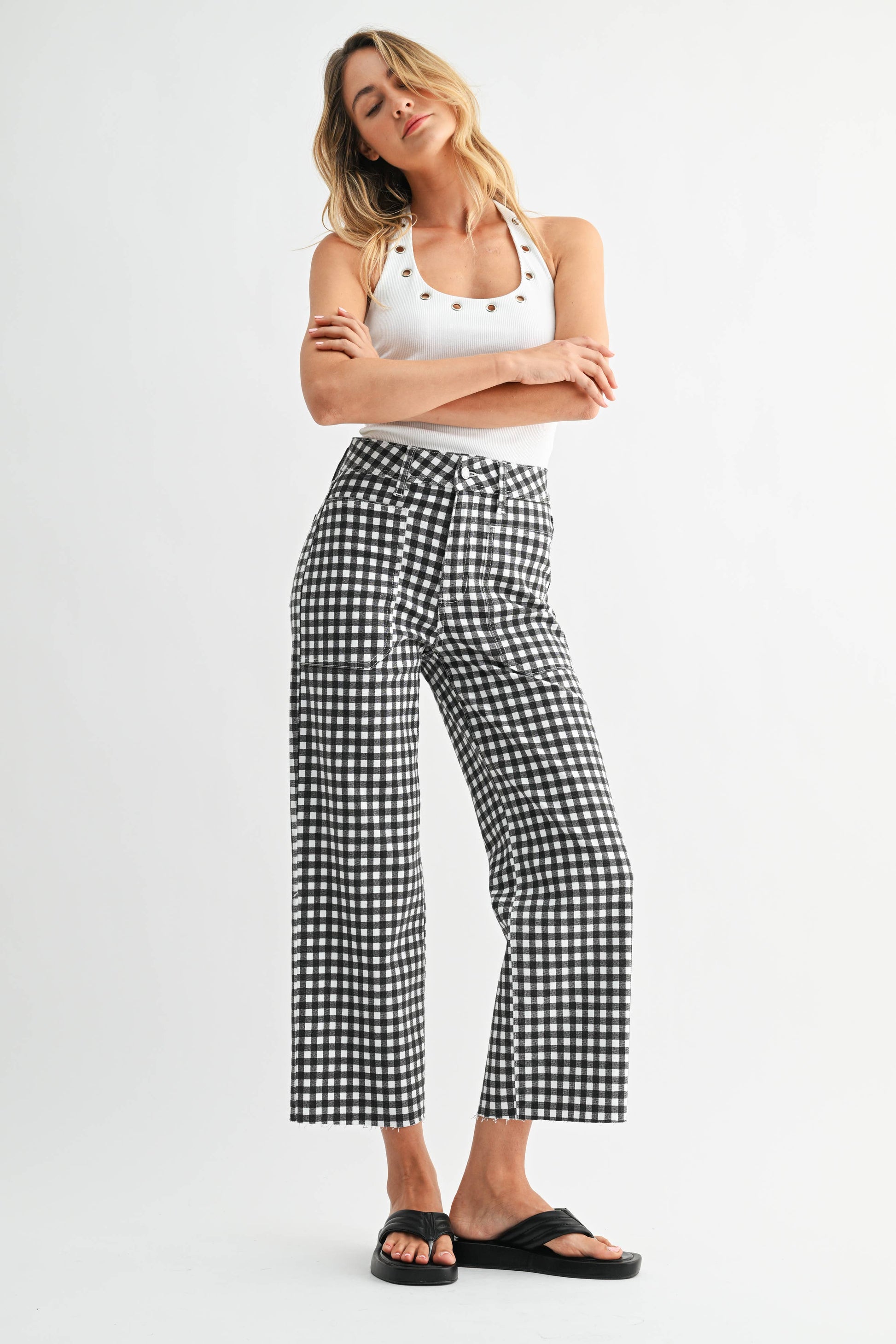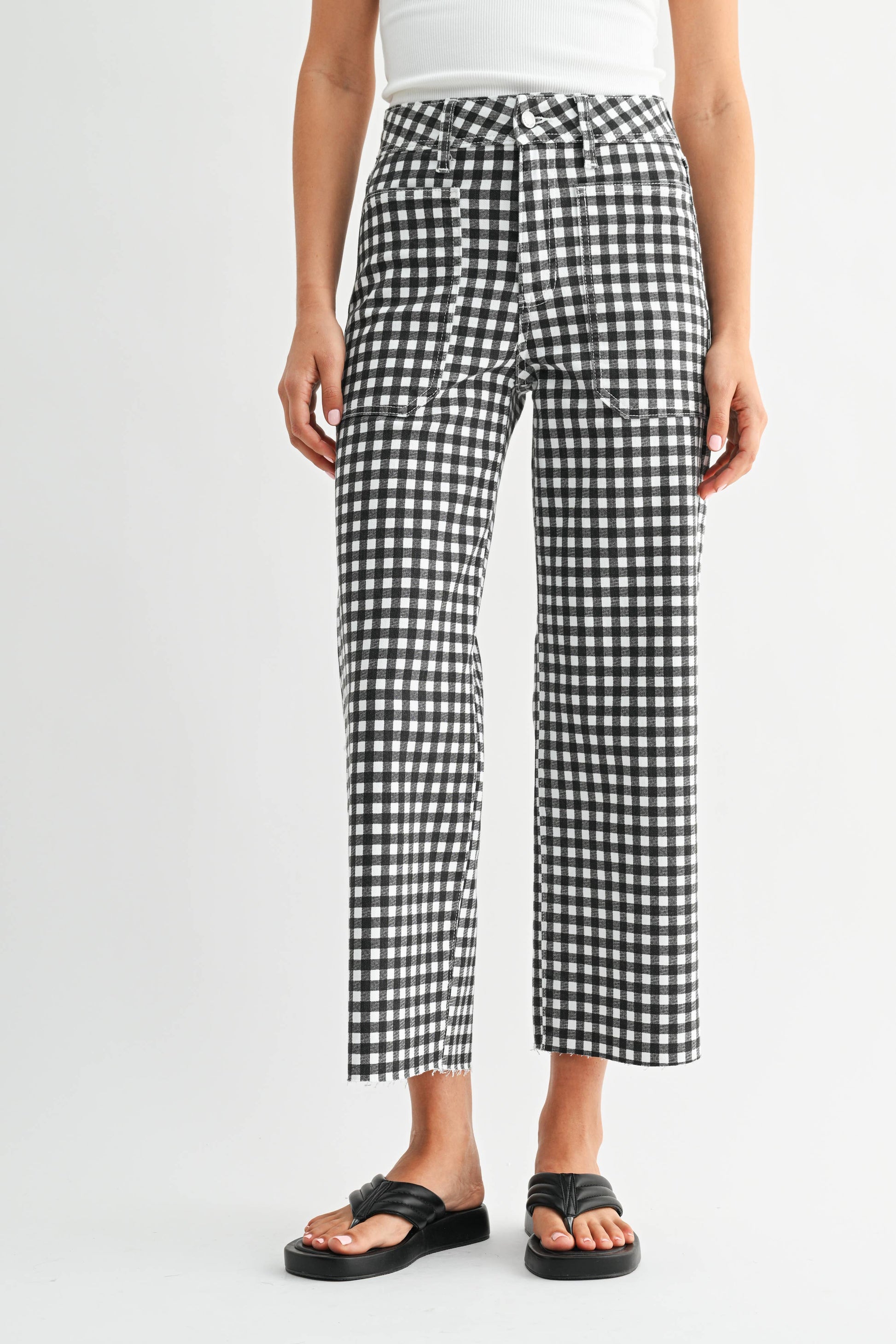 Wide leg jeans are everywhere—and yes, they deserve a spot in your closet. Make a statement in the Nautical Wide Leg, designed in a crisp off-white with a bold black gingham finish. Featuring a flattering high rise and oversized patch pockets that are both functional and dramatic, this pair blends timeless style with modern edge.