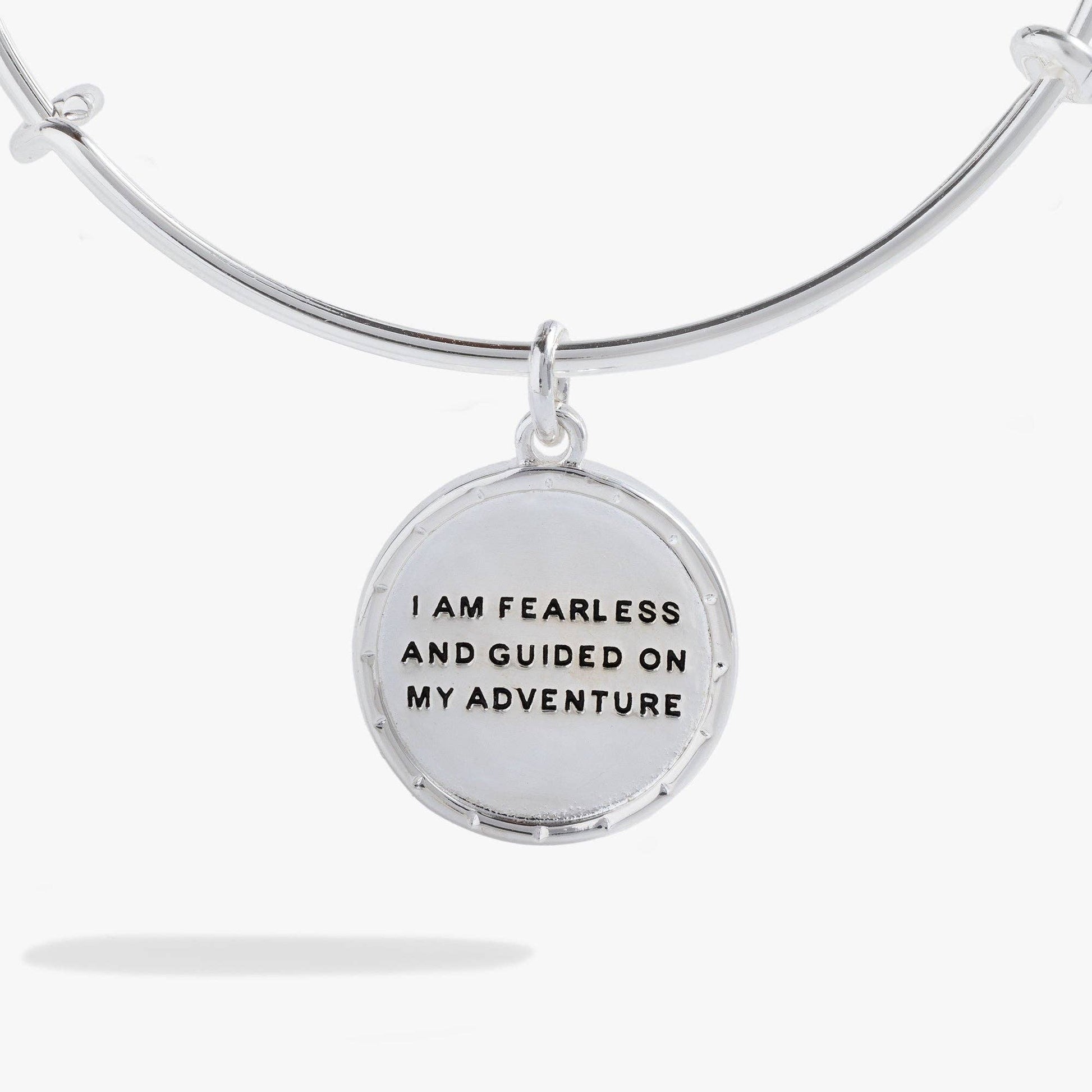 Wear this expandable wire bangle as a reminder that you're never truly lost on your life's journey. Bangle features a circle charm with a compass with a crystal at it's center on one side, and the mantra 'I am fearless and guided on my adventure' on the back.
