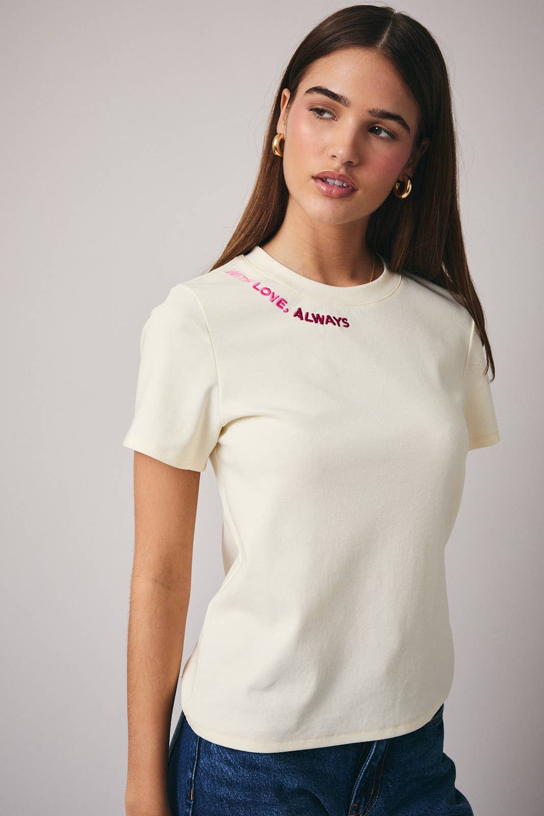 Share a sweet message in everyday style with this Crew Neck Short Sleeve Embroidered T-Shirt. Designed with a classic crew neckline and short sleeves, this tee features delicate lettering embroidery reading “with love, always” for a meaningful, heartfelt touch. Soft, comfortable, and easy to style, it’s perfect for casual days or layering under jackets and cardigans.
