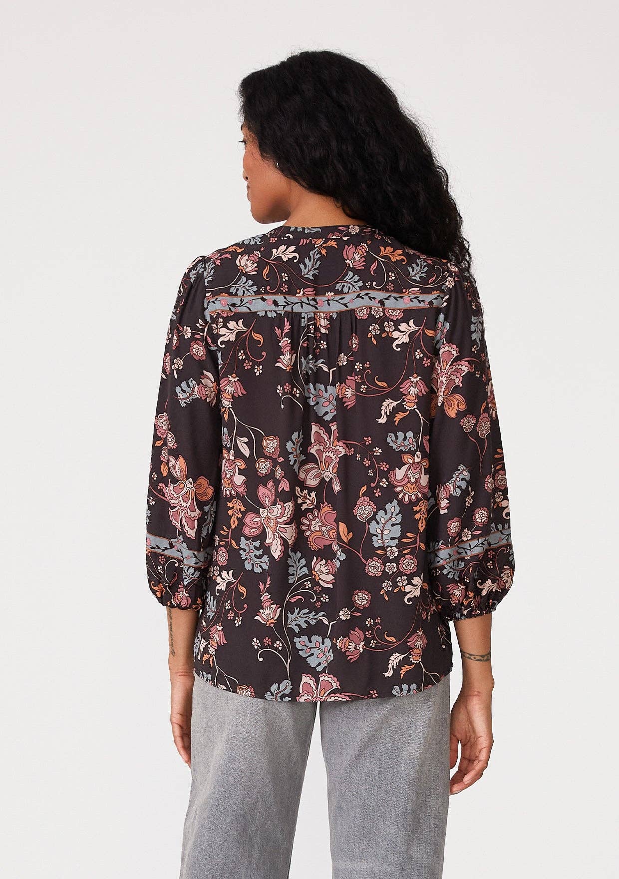Effortlessly chic and easy to wear, our classic fall blouse is designed in a bohemian floral print. Featuring flattering 3/4 length sleeves, a v-neckline, and a tie waist detail. We love to style it with vintage denim and a western-style boot.