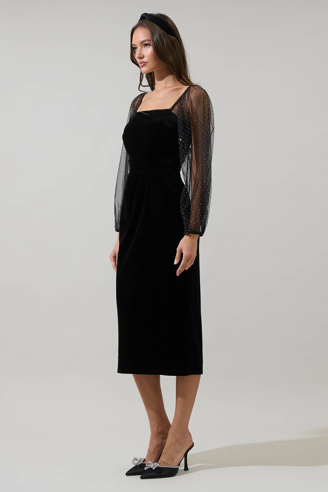 Make a lasting impression in this velvet midi dress that perfectly blends classic charm with modern elegance. Designed with sheer polka dot long sleeves and a flattering square neckline, it creates a sophisticated silhouette with just the right touch of allure. An invisible back zipper ensures a sleek finish, while the rich black velvet makes it an instant statement piece. Style with pointed heels, a structured handbag, and bold earrings for a look that transitions seamlessly from dinner to evening events.