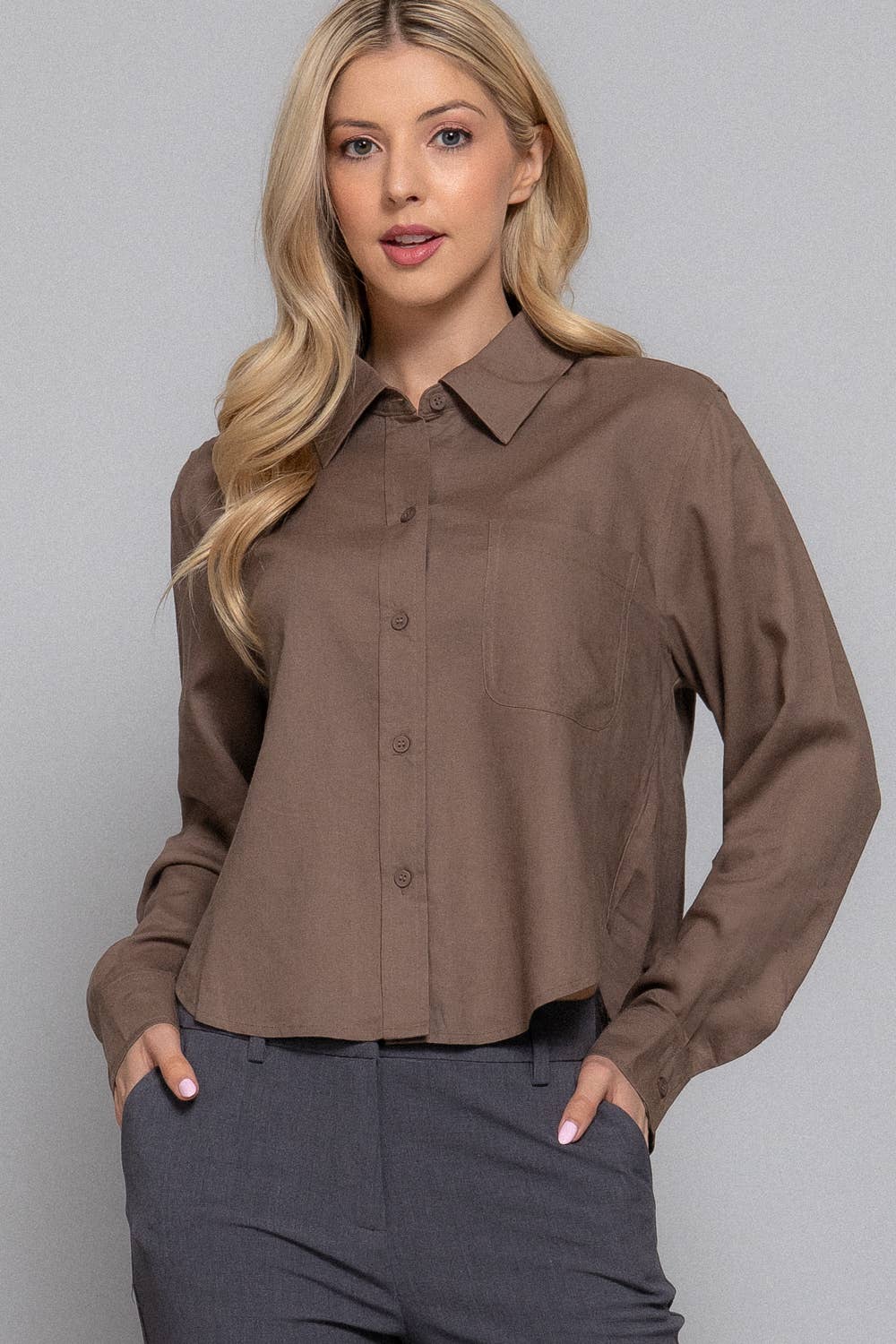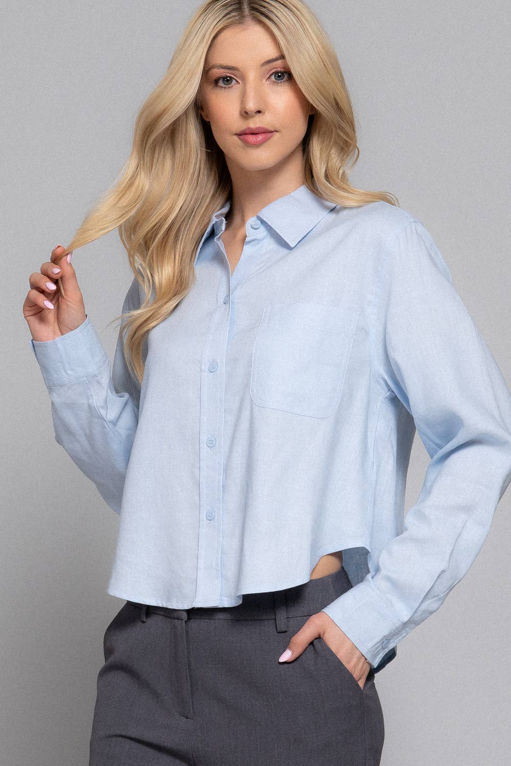 Stay effortlessly chic in this Long Sleeve Button-Down Crop Linen Blend Shirt. Designed in a lightweight, breathable linen blend, this cropped silhouette offers an easy, modern look perfect for pairing with high-waisted jeans, trousers, or skirts. Finished with a classic collar and button-front closure, it’s a warm-weather staple with timeless appeal.