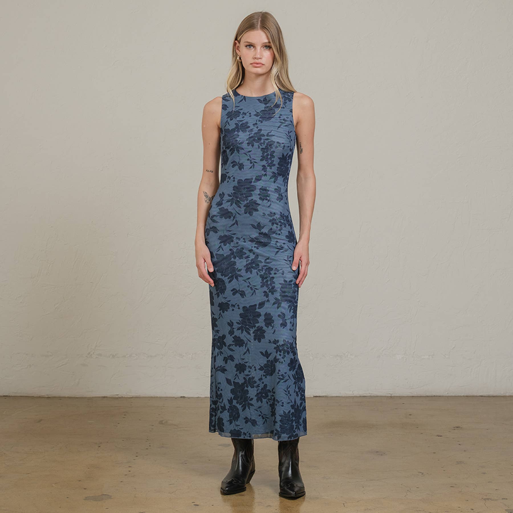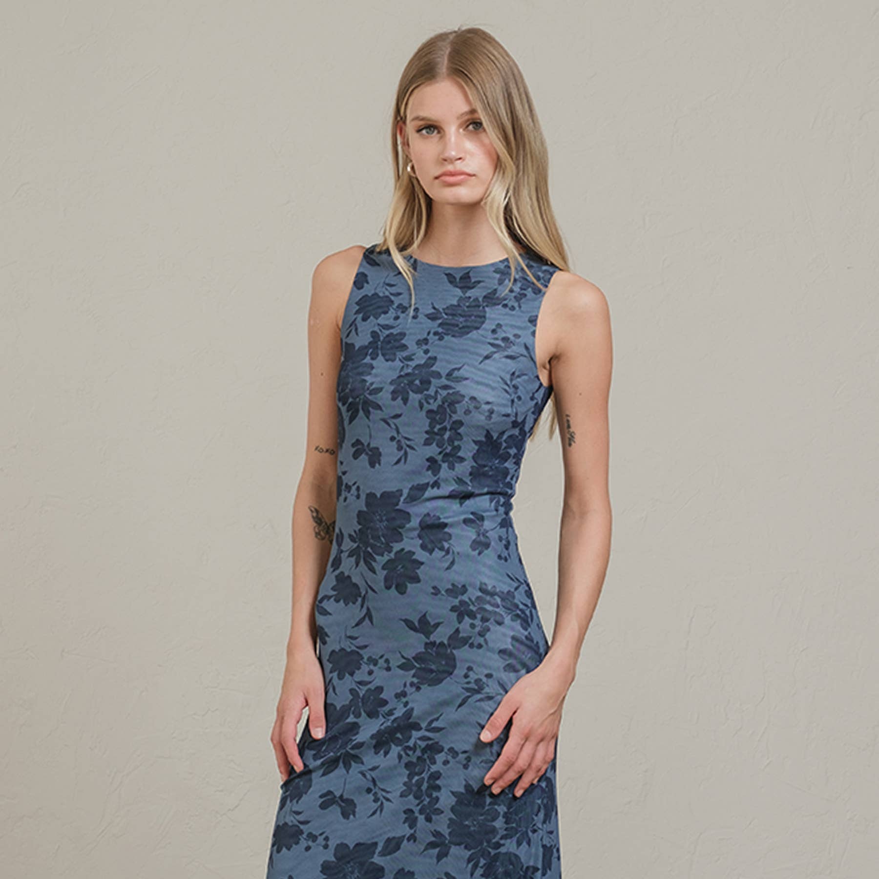 Romantic yet effortlessly modern, this sleeveless midi dress showcases a rich navy floral burnout pattern layered over a smoky mesh base. Crafted with a triple-layer construction for full coverage and a smooth, body-skimming fit, it blends sophistication with comfort. A subtle center back slit adds ease of movement, while the pull-on stretch design ensures a flattering, fuss-free silhouette—perfect for both day and evening occasions.