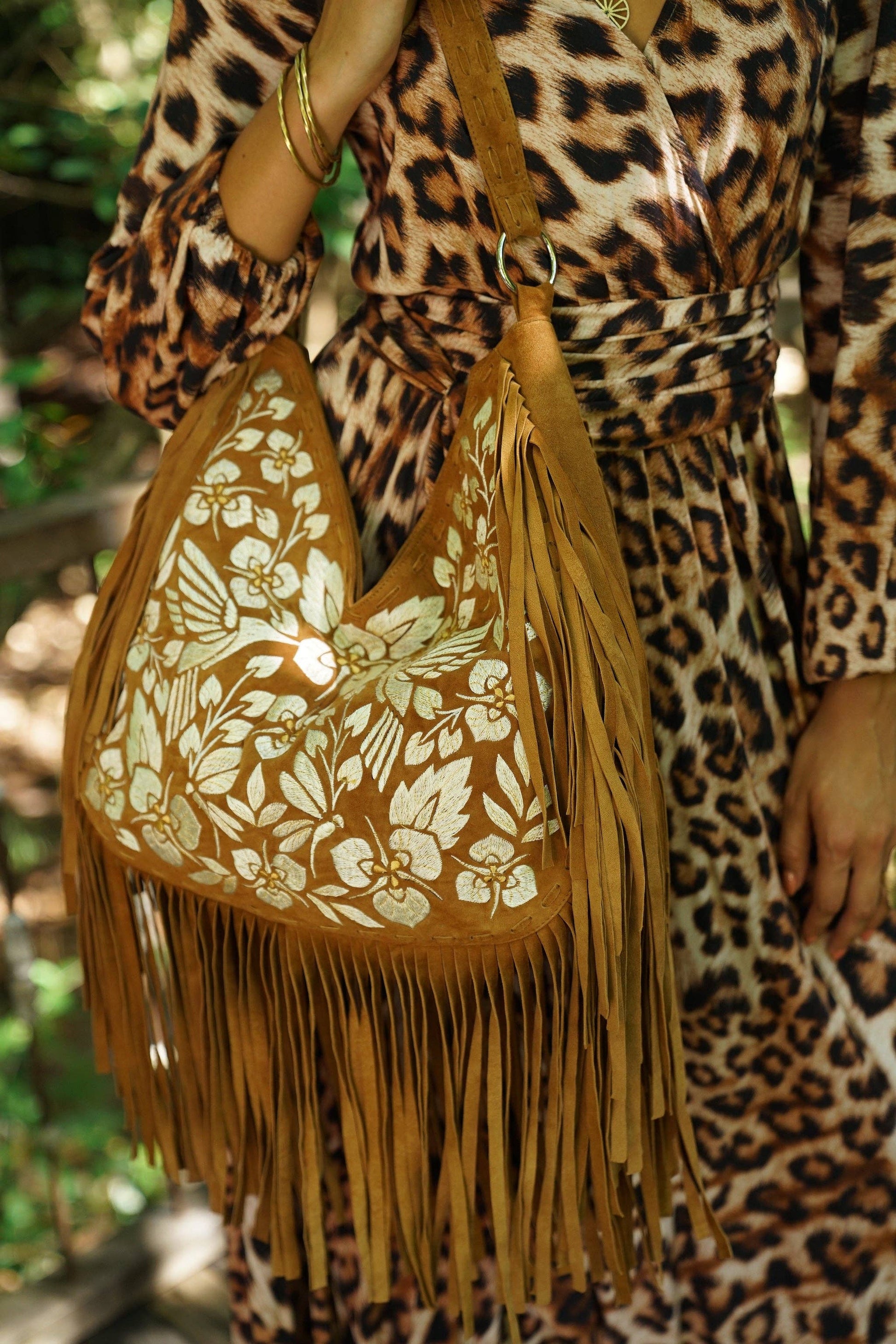 An exquisite handcrafted design featuring intricately embroidered hummingbirds, dragonflies, and Moraea Villosa flowers in shimmering off-white, gold, and silver threads. The body, double fringe detail, and handle are beautifully crafted in rich dark tan suede, exuding timeless bohemian charm.