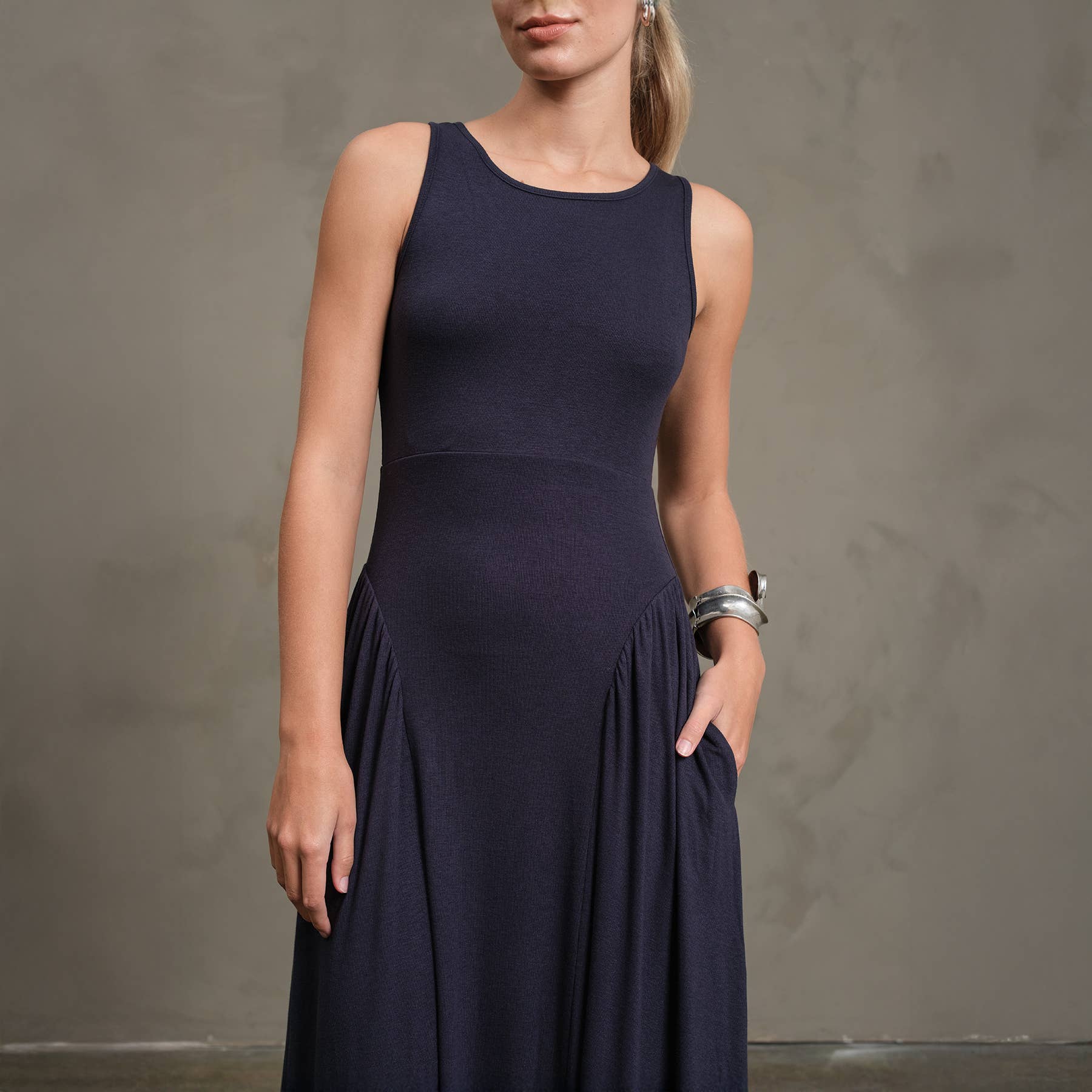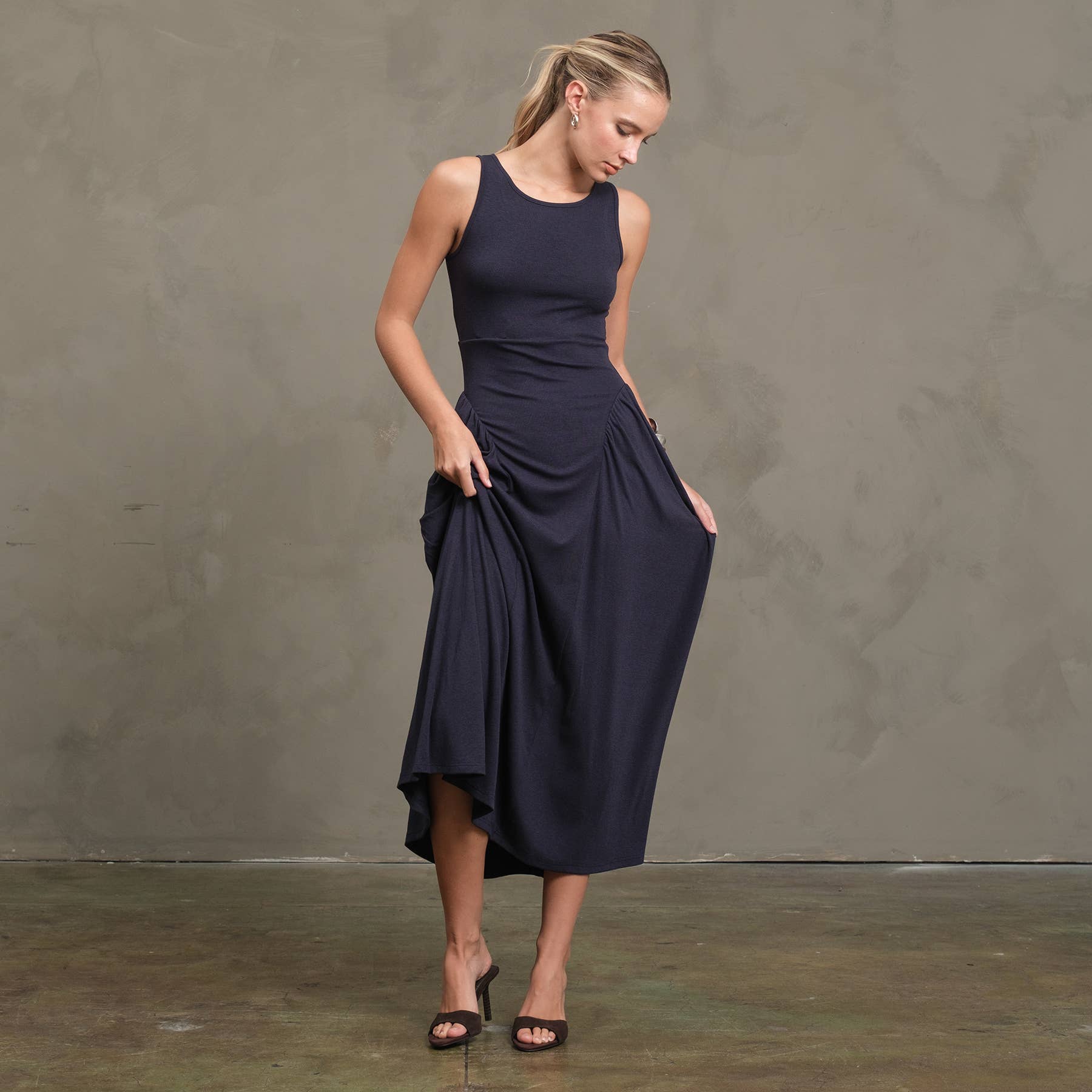 Effortlessly elegant, this fit-and-flare dress features a wide waistband that defines the figure and subtle pleats for graceful movement. Crafted from a lightweight stretch knit fabric, it offers all-day comfort without compromising on sophistication. Finished with convenient side pockets for a modern touch.