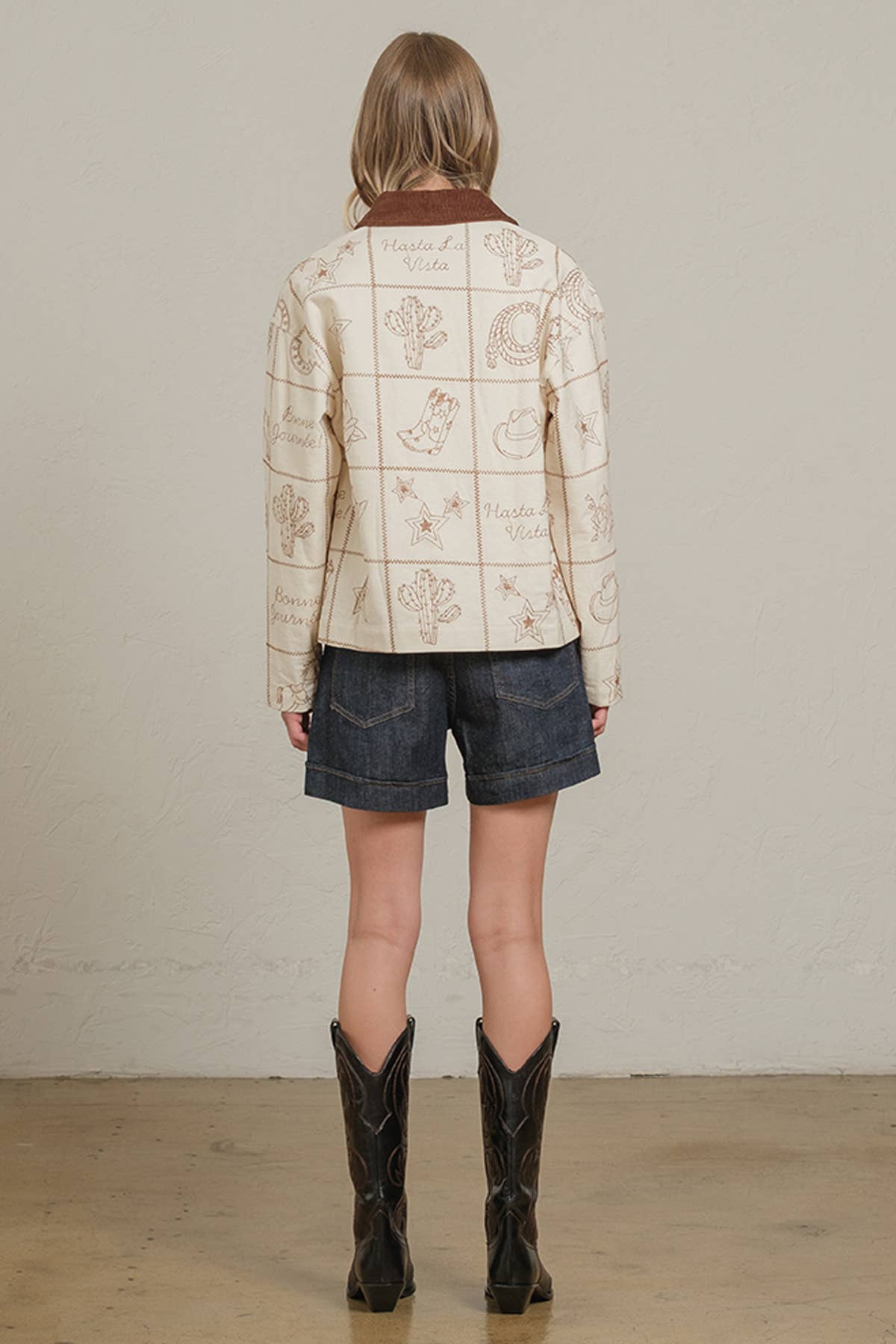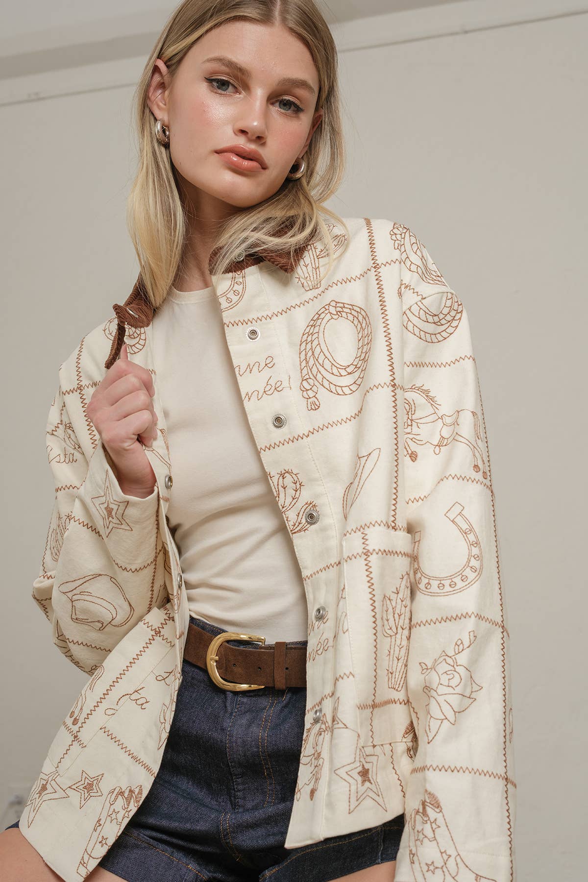 Bring a touch of Western heritage into your wardrobe with this statement embroidered jacket. Featuring an allover cowboy-inspired motif—hats, ropes, stars, and horses—beautifully stitched in contrast thread, this piece blends artisanal craftsmanship with modern style. Finished with a contrast corduroy collar, snap-button front, and a relaxed silhouette, it’s perfect for effortless layering or pairing with denim and boots for a true Americana look.